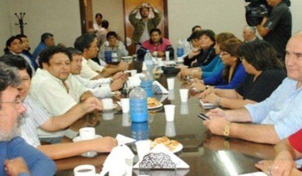 La primera reunión fue en horas de la mañana, cuando los representantes del Gobierno provincial, entre los cuales estaban el ministro de Gobierno, Hugo Echavarri y el Secretario de Egresos Públicos Miguel Ángel Lasquera, recibieron en el salón del bloque del PJ a los dirigentes del FGE (SEOM, ATSA, SOEMFA y UTENOF).