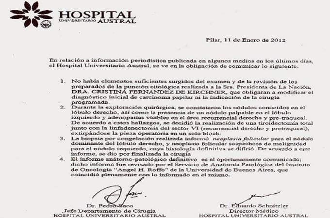 En un comunicado oficial que lleva la firma del cirujano Pedro Saco y del director médico del nosocomio, Eduardo Schnitzler, agregaron además que "durante la exploración quirúrgica se constataron los nódulos conocidos en el lóbulo derecho, así como la presencia de un nódulo palpable en el lóbulo izquierdo" de la tiroides.
