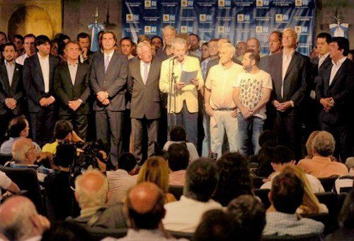 La lectura del documento de cuatro puntos estuvo a cargo del apoderado partidario, el diputado Jorge Landau, quien estuvo acompañado por el gobernador bonaerense, Daniel Scioli; el jefe de Gabinete, Jorge Capitanich, el presidente de la Cámara de Diputados, Julián Domínguez y el jefe del bloque de senadores del FPV, Miguel Pichetto. Pese a que la plana mayor del partido reunió a gobernadores, legisladores y dirigentes de todo el país, resultaron llamativas las ausencias del secretario General de la Presidencia, Aníbal Fernández, y el ministro del Interior y Transporte, Florencio Randazzo, ambos vicepresidentes del partido.