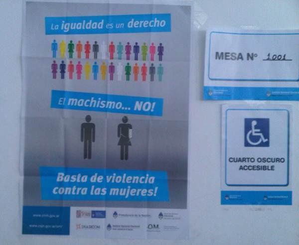 Todos los centros de votación habilitados para emitir el sufragio tendrán losafiches que forman parte de la campaña contra el Machismo acompañados por frases como "La igualdad es un derecho, el machismo no. Basta de violencia contra las mujeres".