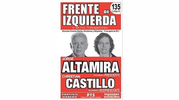 El rojo también es el color del Frente de Izquierda, que lleva una foto central de los candidatos, Jorge Altamira y Christian Castillo. En el borde inferior aparecen los nombres de las agrupaciones que integran el espacio, el Partido Obrero, el PTS y la Izquierda Socialista.