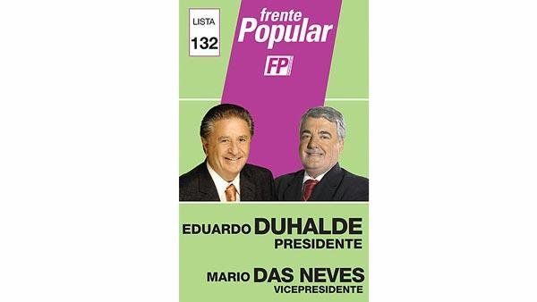 El Frente Popular obtuvo el tono verde mezclado con el fucsia. Sin demasiadas inscripciones, solamente con los datos necesarios, la imagen que resalta, en colores, es la de los precandidatos, Eduardo Duhalde y Mario Das Neves.