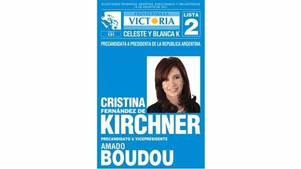 El azul fue el tono elegido por la fórmula Cristina Kirchner - Amado Boudou. Con una foto principal de la Presidenta, la boleta está adormada con la bandera argentina, que lleva el logo del Frente para la Victoria, y en la esquina superior izquierda, la imagen de Perón y Evita.