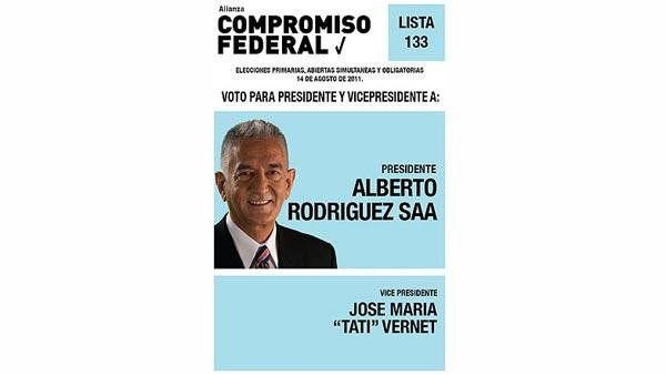 La Alianza Compromiso Federal se quedó con el color celeste. A la izquierda, una foto de Alberto Rodríguez Saá ocupa el espacio. Más abajo, y sin ningún tipo de acotaciones, el nombre del precandidato a vice, José María "Tati" Vernet.