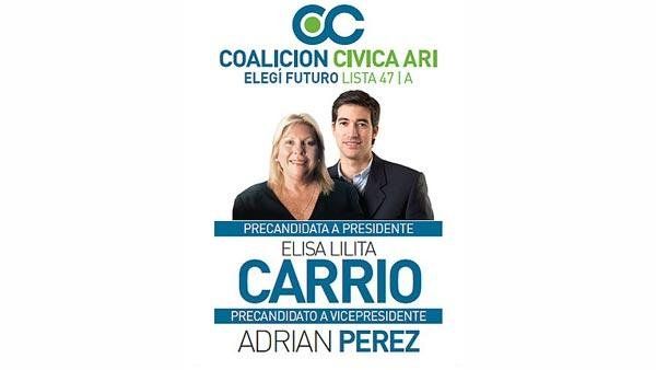 A Elisa Carrió y Adrián Pérez, por la Coalición Cívica, también le correponde el azul, pero mezclado con el verde. Con el mensaje "Elegí futuro", la boleta lleva la foto de los dos integrantes de la fórmula. La perlita de este diseño es que la precandidata a la presidencia es llamada "Elisa Lilita Carrió".