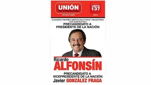 La Unión Cívica Radical se quedó con colores muy llamativos, el rojo y el blanco. Una gran imagen de Ricardo Alfonsín llena la boleta. Más abajo, el nombre del precandidato a vice, Javier González Fraga.