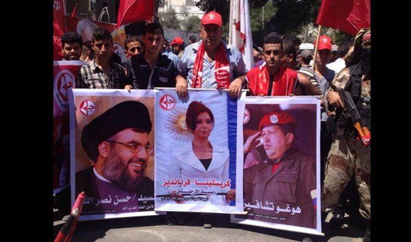 La agencia Arabi Press publica fotos de una marcha de las Brigadas de Resistencia de Abu Ali Mustafa, el ala militar del Frente Popular para la Liberación de Palestina. Las imágenes dejaban ver banderas de la organización terrorista Hezbollah y las fotos de su líder Hassan Nasrallah, banderas palestinas y carteles en donde aparecían Hugo Chávez y Cristina que son llamados "el eje de la resistencia".