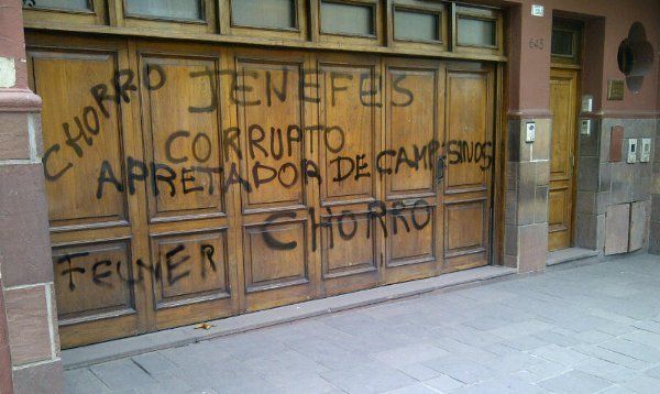 Luego del acto, en una improvisada conferencia de prensa, dijo que esperaba que el gobierno no los recibiera por la tarde. Esas declaraciones enardecieron aún más los ánimos de los trabajadores que decidieron marchar hasta la casa de Jenefes en calle Independencia, donde realizaron pintadas en un portón de madera.