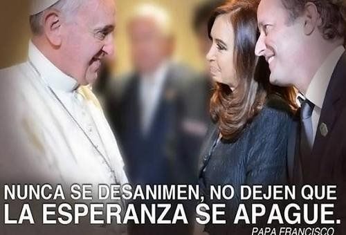 Un afiche con la fotografía del saludo que el papa Francisco tuvo en Brasil con la presidenta Cristina Kirchner y el precandidato a diputado del oficialismo en la provincia de Buenos Aires, Martín Insaurralde, apareció hoy en las calles porteñas.
