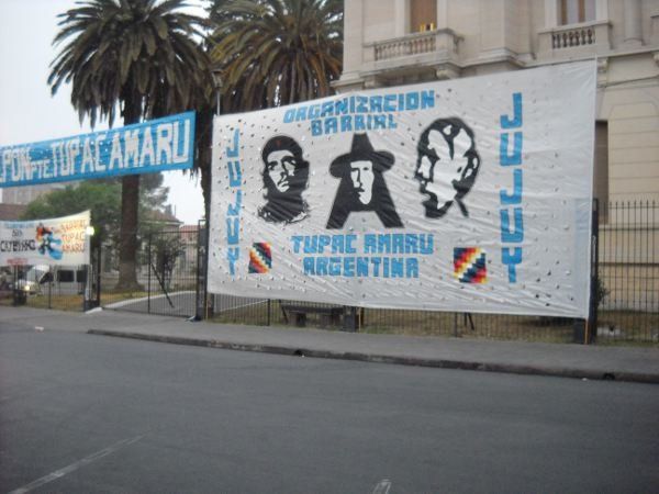 La Organización Barrial Tupac Amaru, que apoya a los candidatos del FPV, ha preparado los festejos frente a la Casa de Gobierno. Para ello desde temprano se instaló el escenario y los carteles de la organización.