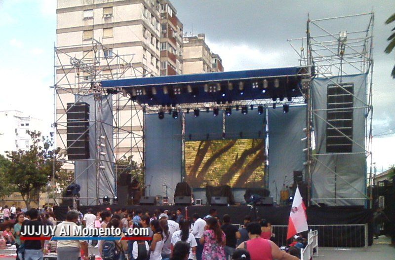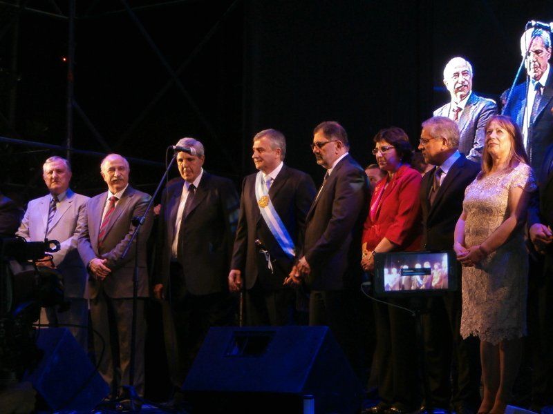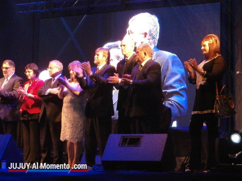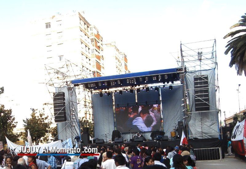 El escenario montado prácticamente en las puertas de Casa de Gobierno, fue al mejor estilo de los grandes festivales folklóricos que se hacen en la provincia. Como fondo una gigante pantalla donde se reprodujeron todas las instancias de la ceremonia que se llevaba a cabo en la Legislatura de la provincia.