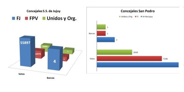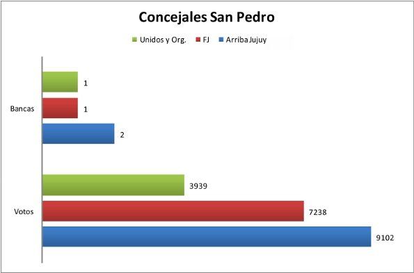 En San Pedro de Jujuy, la elección fue más polarizada y fue notable el crecimiento de “Arriba Jujuy”, que cosechó 9.102 votos (29,78%) para concejal, con Carolina y Julio Moisés a la cabeza. De esta manera consolidó un proyecto político que nace y se expande desde el interior de la provincia, transformándose en una alternativa de caras al 2015.