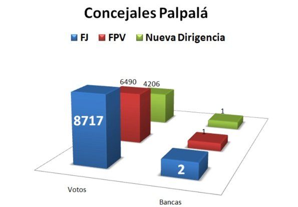 En Palpalá también se hizo sentir el voto castigo, renovando dos banca el radicalismo, con 8.717 votos, el Frente para la Victoria con 6.490 posicionó en el Concejo a Elsa Durán y Nueva Dirigencia la colectora del PJ, con 4.206 votos a Alfredo Guerry.