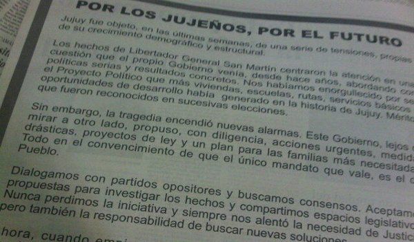 Mientras el gobierno provincial titula su comunicado: “Por los jujeños, por el futuro”, la UCR y el Partido Lyder publicaron una solicitada titulada “El gobierno no gobierna”.