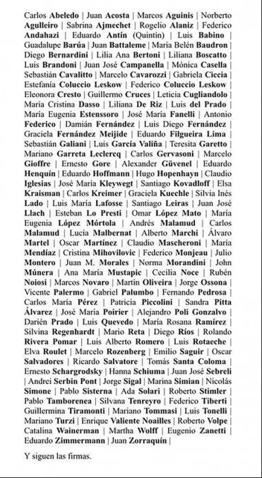 Algunos de los que sí confirmaron su adhesión fueron los economistas José Anchorena y Miguel Gorelik, el cineasta Raúl Beceyro, la poeta Marilyn Contardi, los arquitectos Jorge Silvetti y Rodolfo Machado, ambos profesores de la Universidad de Harvard, Guillermo Campitelli, jefe del departamento de psicología de la Murdoch University en Australia, el doctor en ciencias biológicas e investigador del CONICET Martín Vázquez, y la doctora en Economía y profesora de estadística en la Universidad de Ciencias Aplicadas de Heilbronn de Alemania, Graciela Kuechle y el director del programa de bioeconomía Fernando Vilella.