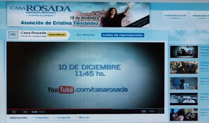 La ceremonia de asunción de Cristina Fernández de Kirchner, se transformará en la primera vez que YouTube transmita en vivo la jura de un presidente.
