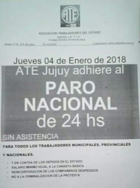 El secretario general de ATE Jujuy, Cristian Brizuela confirmó que adherirán a la medida nacional de paro de 24 hs. sin asistencia a los lugares de trabajo, para este jueves 4 de enero.