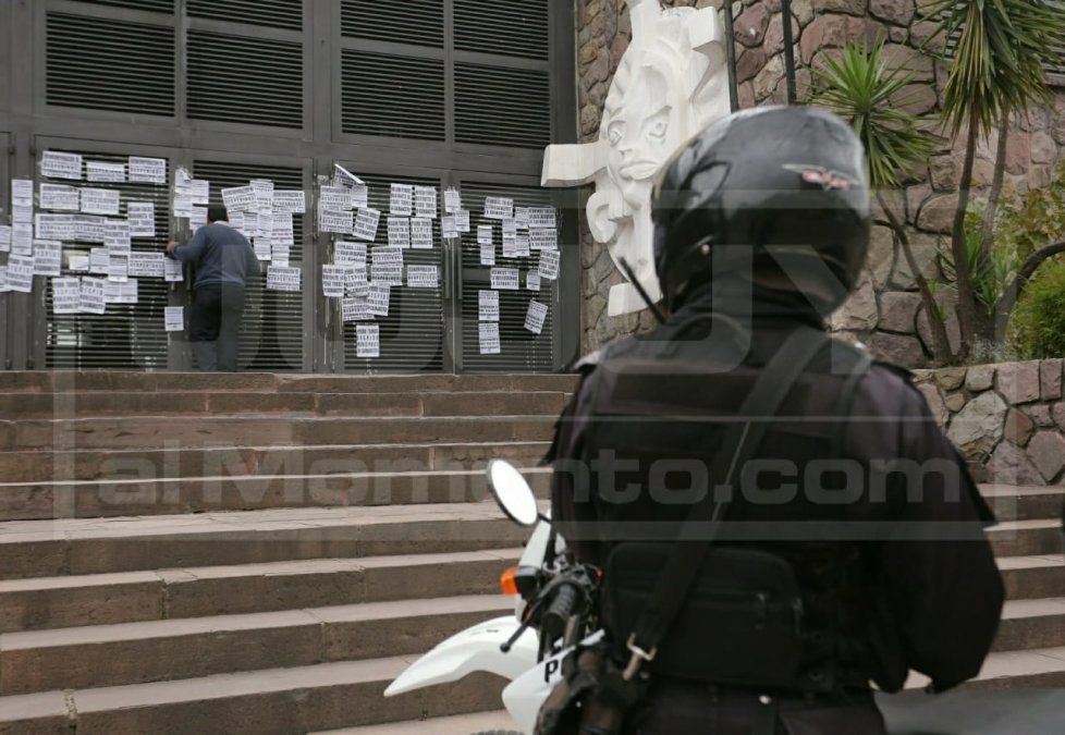 Integrantes del sindicato de los municipales pegaron diferentes afiches en la Legislatura provincial en contra del Nelson Torres y su hermano, por supuestos despidos de trabajadores infundados.