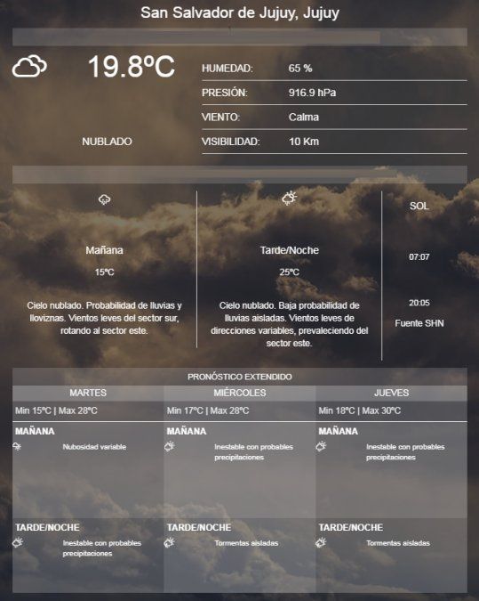 En tanto que para el resto de la semana anuncia, martes con nubosidad variable y probabilidad de lluvias hacia la noche, miércoles inestable con tormentas aisladas a la noche e idéntico pronóstico para el jueves.