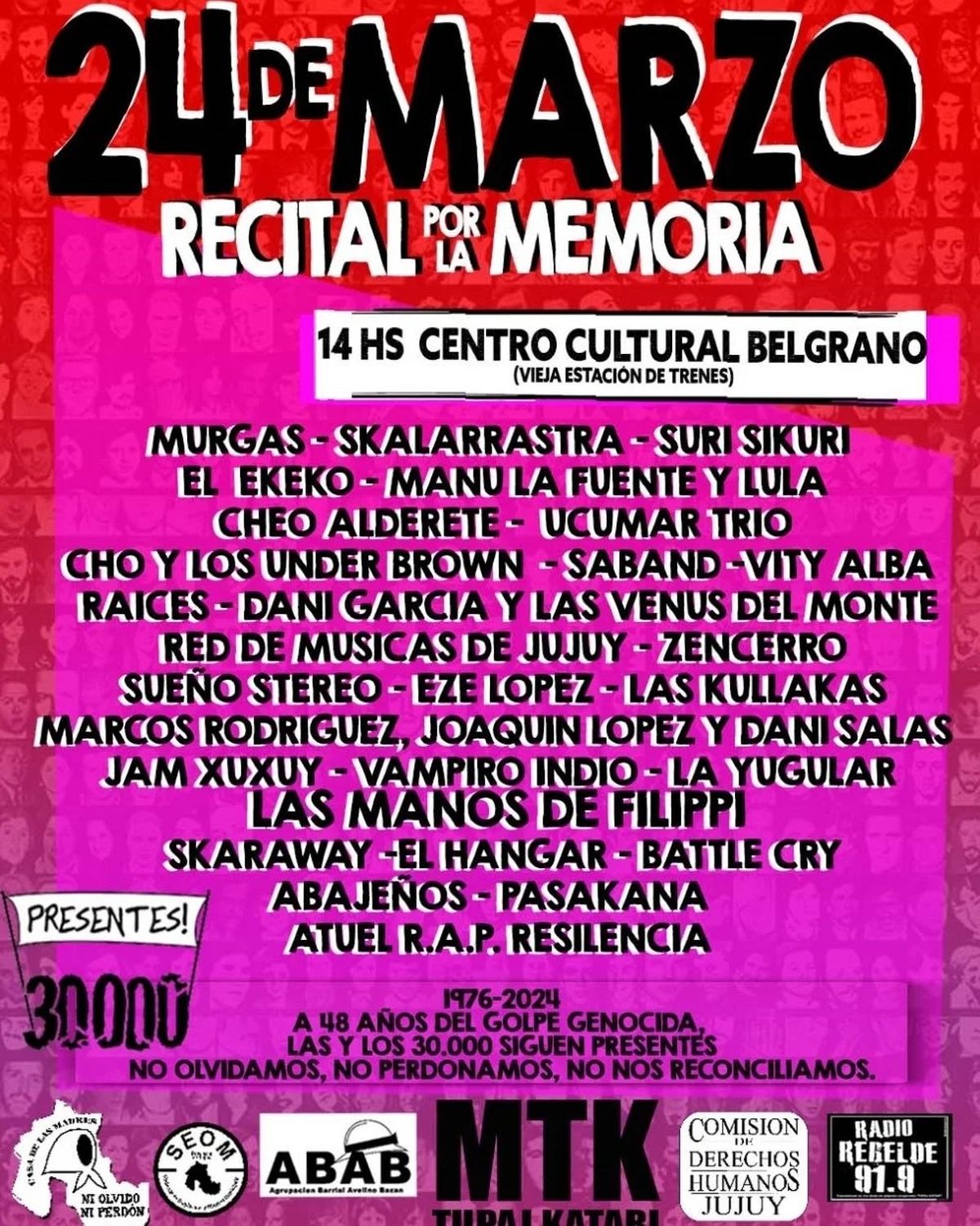 Con motivo de conmemorarse el Día de la Memoria, la Verdad y la Justicia, el recital se realizará este domingo 24 de marzo a partir de las 14 hs. en el Centro Cultural Manuel Belgrano (vieja estación).