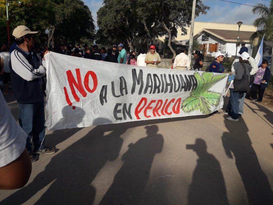 A menos de un mes de concretada la primera marcha contra la producción de cannabis medicinal, una multitud participa de un reclamo con carteles que tienen las consignas “no a la droga“ y “no le quiten el trabajo a los productores”.