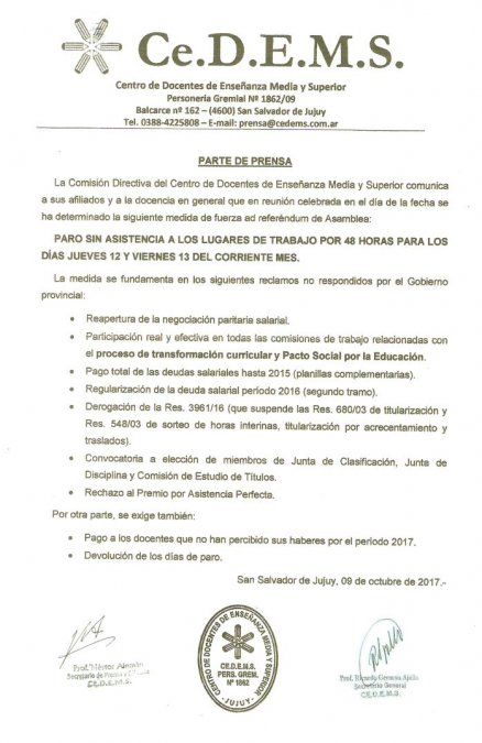 La medida se confirmó a través de un comunicado de prensa, “esperamos que la docencia nos acompañe y que el gobierno nos dé respuestas a los planteos que se vienen realizando desde hace tiempo”, manifestó Julio Congín Secretario Técnico y Legal del CEDEMS.