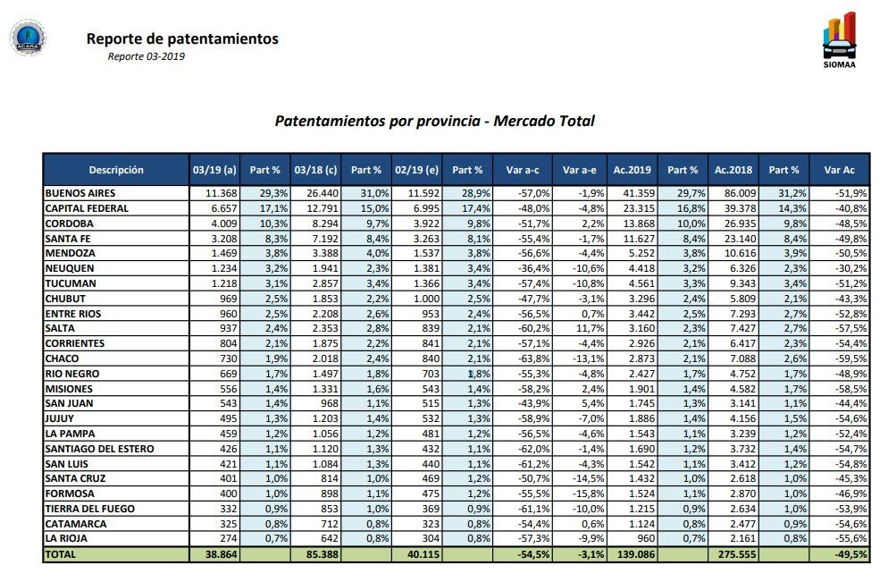 Es lo que informó ACARA sobre automóviles para marzo interanual. El derrumbe se advierte en todas las provincias.