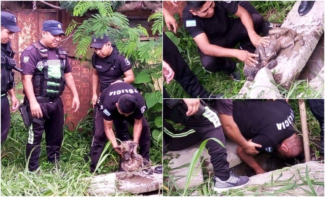 Policías rescataron a un perrito que cayó a un pozo de desagüe