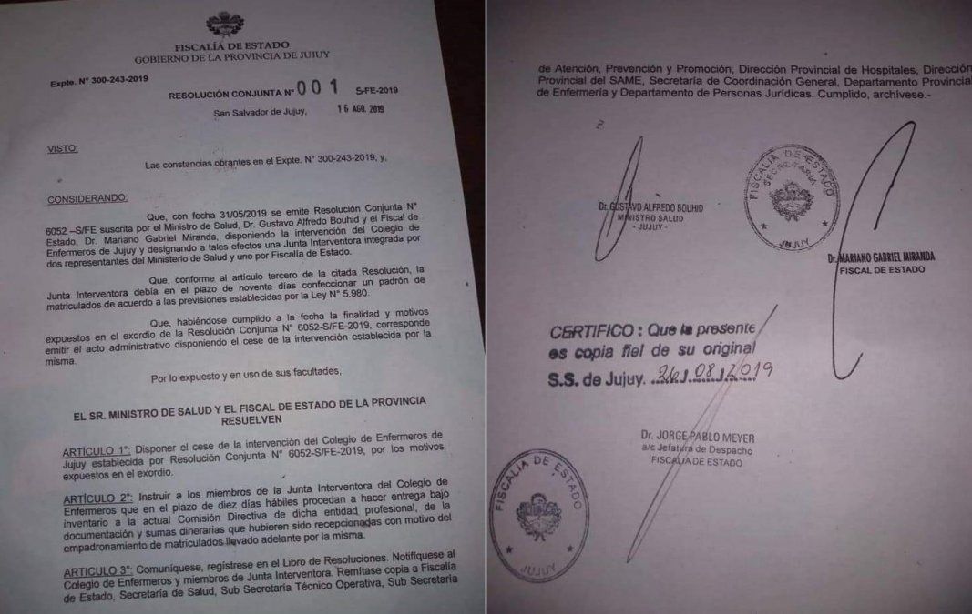 Ahora, a través de una resolución firmada por el Fiscal de Estado Mariano Miranda y el ministro de Salud Gustavo Bouhid se deja sin efecto la intervención que caía sobre el Colegio de Enfermeros de la provincia.