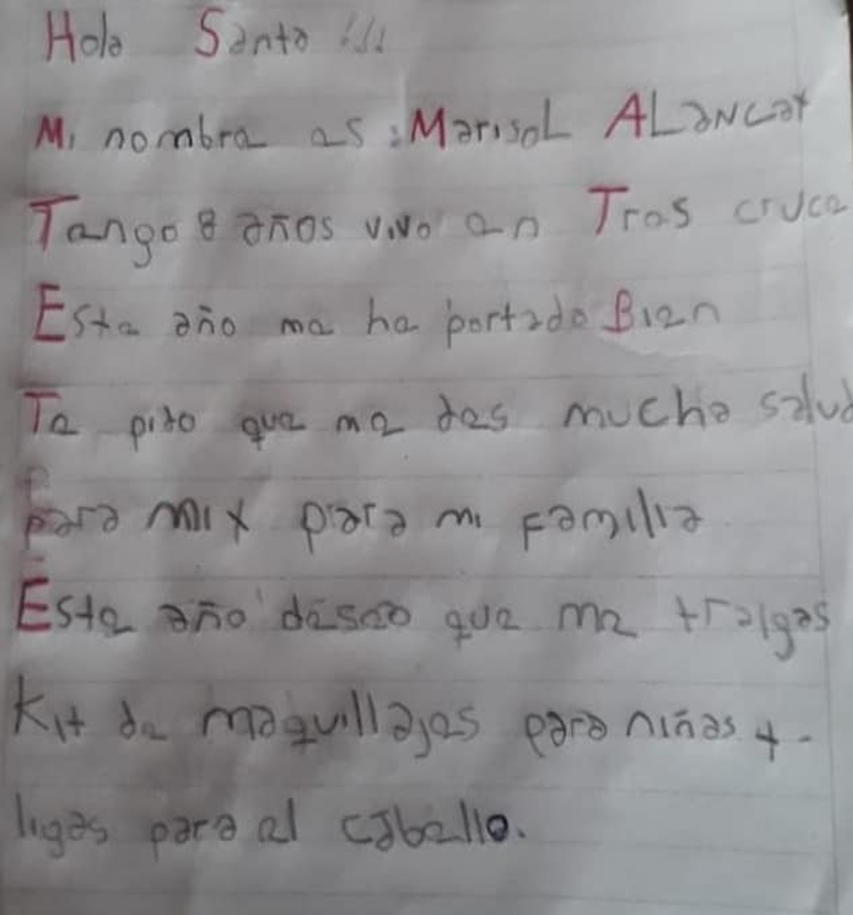 La carta, que fue difundida en una publicación de la página de Facebook de Tinkunakama", en donde además señala que este año (desde el 2023) se portó muy bien y les solicitó a los Reyes Magos un kits de maquillajes para niñas.