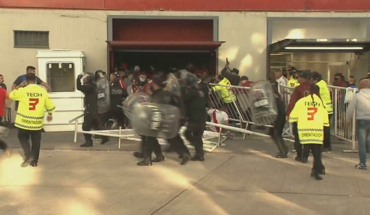 Los efectivos intentaron frenar el avance de los hinchas a palazos, pero igualmente muchos lograron saltar los molinetes y entrar.