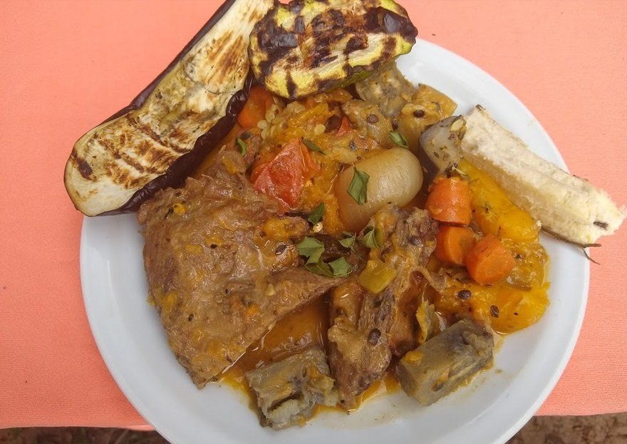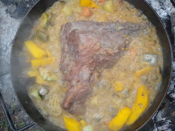 Colocar la carne (lomo filet o un vacío) en una cacerola y dorarla en los fuegos de la parrilla, luego agregar de a una las verduras y frutas que tengas (cebollas moradas, berenjena, zapallitos zuchini, tomates, plátanos verdes, papaya verde).