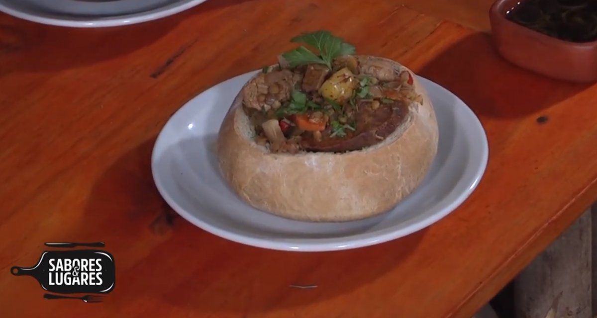 Luego colocar en el fuego el pan casero, previamente hacerle un hueco. Mezclar y retirar el guiso del fuego, servirlo en el pan y disfrutar.