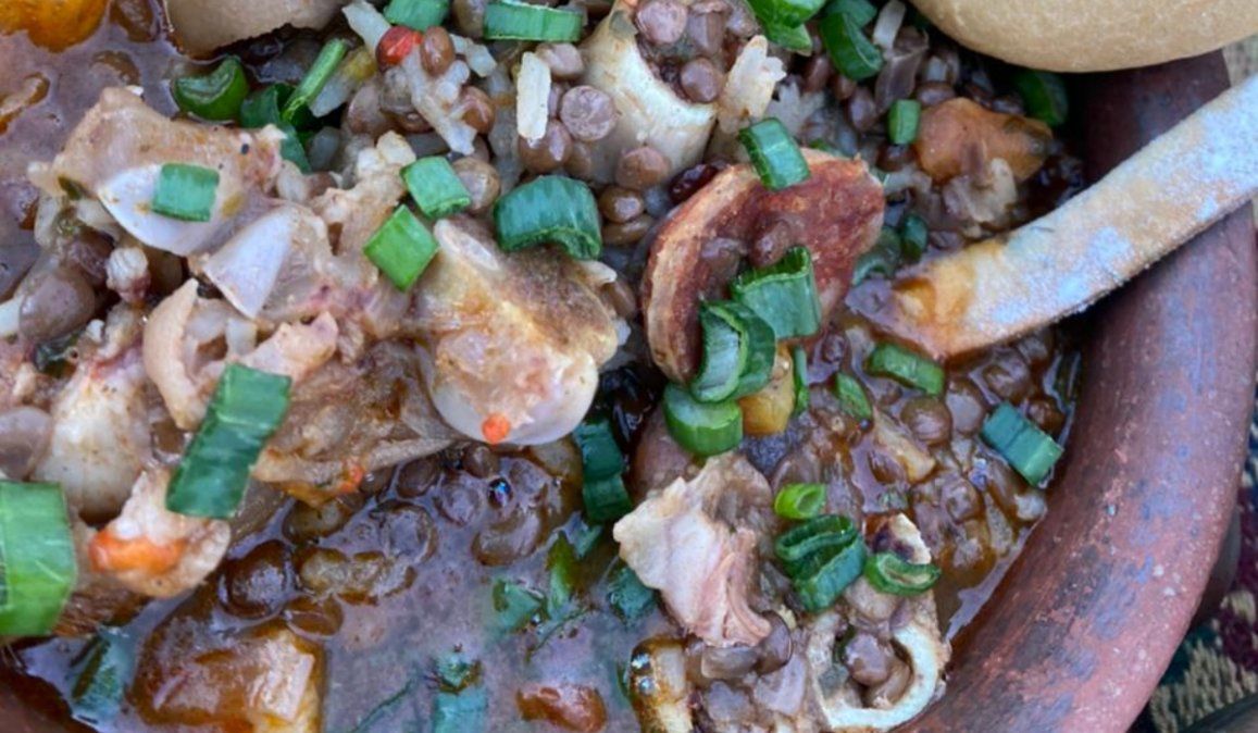 A la preparación de vegetales agregarle las patas cocidas, el arroz, la lenteja, panceta y el chorizo. Condimentar con sal, pimienta, pimientos y ají molido a gusto.