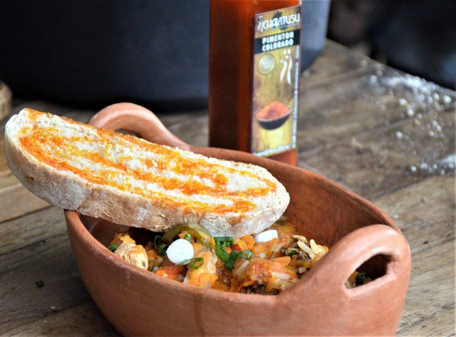 En una cazuela y plato hondo servir el guiso teniendo en cuenta que salga bien repartido. Acompañar con un tostón de pan de capo con un poco de aceite de oliva saborizado Chakytusu.