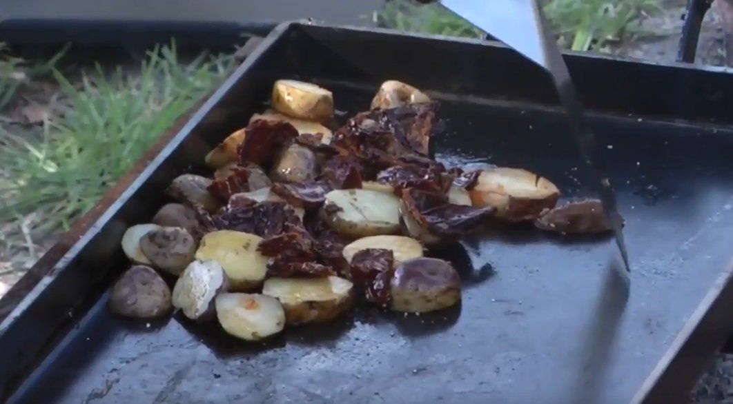 Cortaremos los tomates en tiras no muy finas y las papas por la mitad para llevarlas a la chapa o sartén.