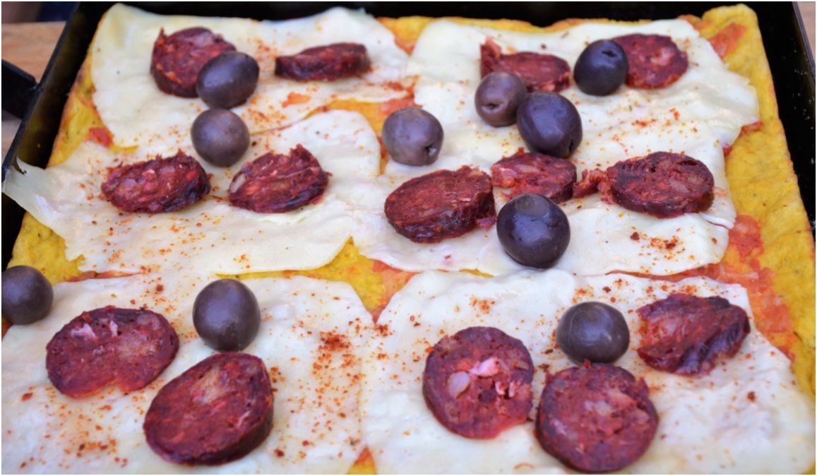 Desgasificar y estirarla de 1/2 cm. de espesor y acomodarla sobre la pizzera aceitada de 30cm. de diámetro, pinchar con un tenedor. Dejar levar que duplique su volumen y llevar al horno moderado a caliente durante 20min.