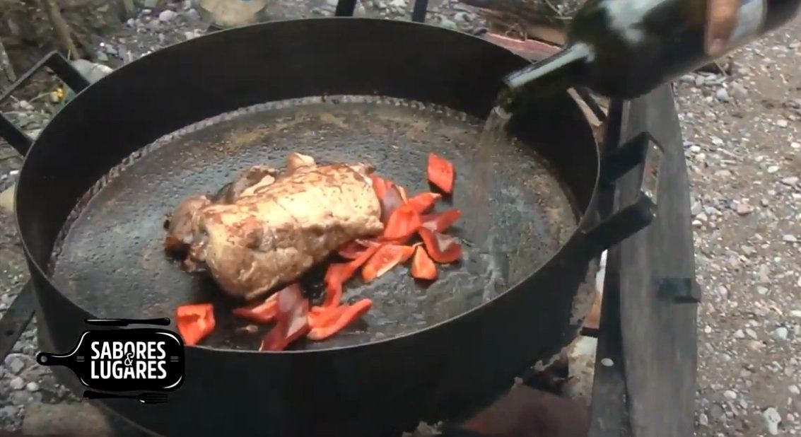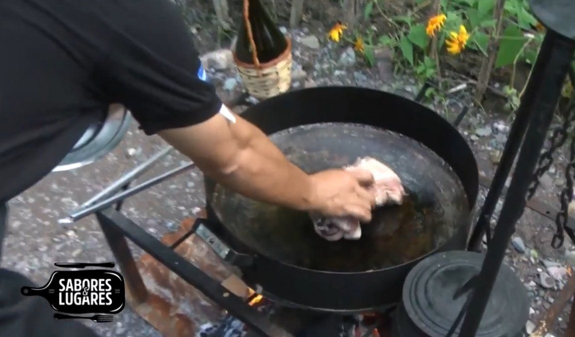 Colocar el disco de arado al fuego para que vaya calentando. También poner una olla con agua, para blanquear nuestros papines. Llevar el lomo al disco de arado, previamente calentado, para dar un buen sellado.
