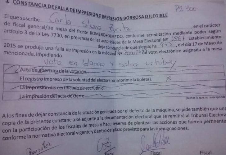 Esta mañana, en las elecciones de la provincia de Salta, una fiscal general de mesa por el frente Romero-Olmedo debió expedir una "Constancia de falla de impresión o impresión borrosa o ilegible", dado que un ciudadano votó en blanco y salió impresa la boleta de Juan Manuel Urtubey.