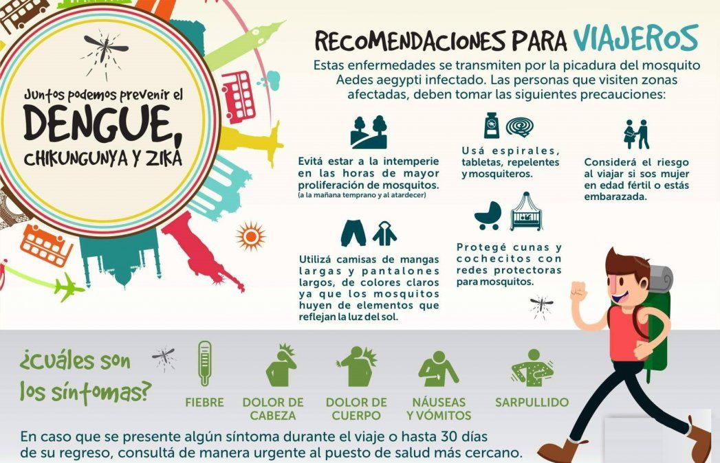 Desde el Ministerio de Salud de la Provincia brindaron recomendaciones para viajeros que caigan en zonas donde se encuentra el mosquito Aedes aegypti. Se aconseja evitar estar a la interperie en las horas de mayor proliferación de mosquitos, estas son a la mañana temprano y al atardecer.