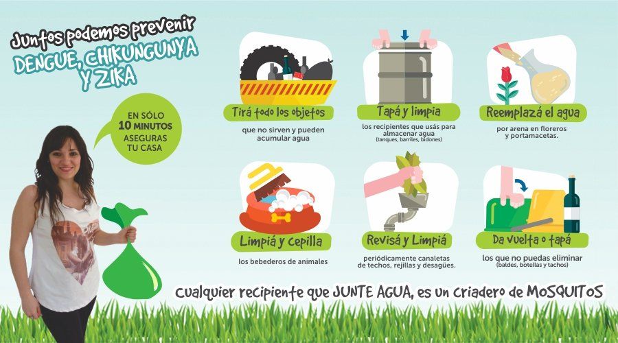Lo principal es tirar todos los objetos que pueden servir para acumular agua, colocar tapas y limpiar los recipientes, remplazar el agua, limpiar y cepillar los bebederos de animales, revisar y limpiar periódicamente el techo, rejilla y desagües. Dar vuelta o tapar los objetos en los que se puedan acumular agua.