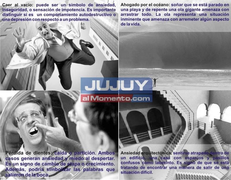 Caer al vacío: muchos han tenido por lo menos alguna vez la sensación de estar cayendo de un precipicio para luego descubrir que la supuesta caída era sólo un estremecimiento en la cama y que el precipicio sólo existía en su mente. Según la experta, las caídas pueden ser un símbolo de ansiedad, inseguridad, o una sensación de impotencia. En este caso es importante distinguir si se trata de un comportamiento autodestructivo o una profunda depresión con respecto a un problema.
