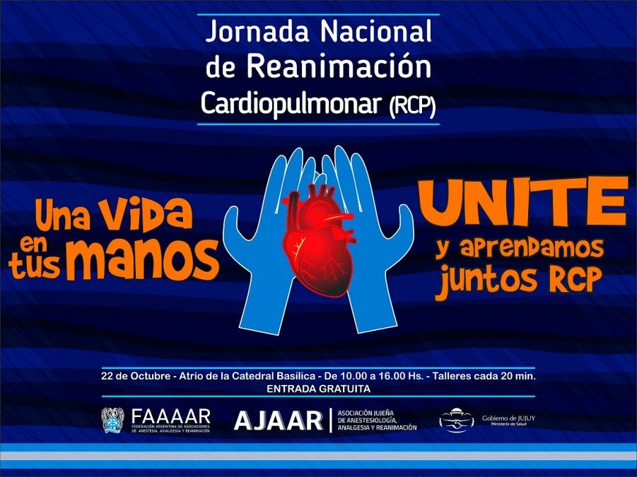 El sábado 22 de octubre, en plaza Belgrano se realizará el curso de RCP gratuito en Jujuy. Desde las 10:00 hasta las 16:00 en el atrio de la Catedral Basílica, se podrá ir en cualquier momento sin inscripción previa.