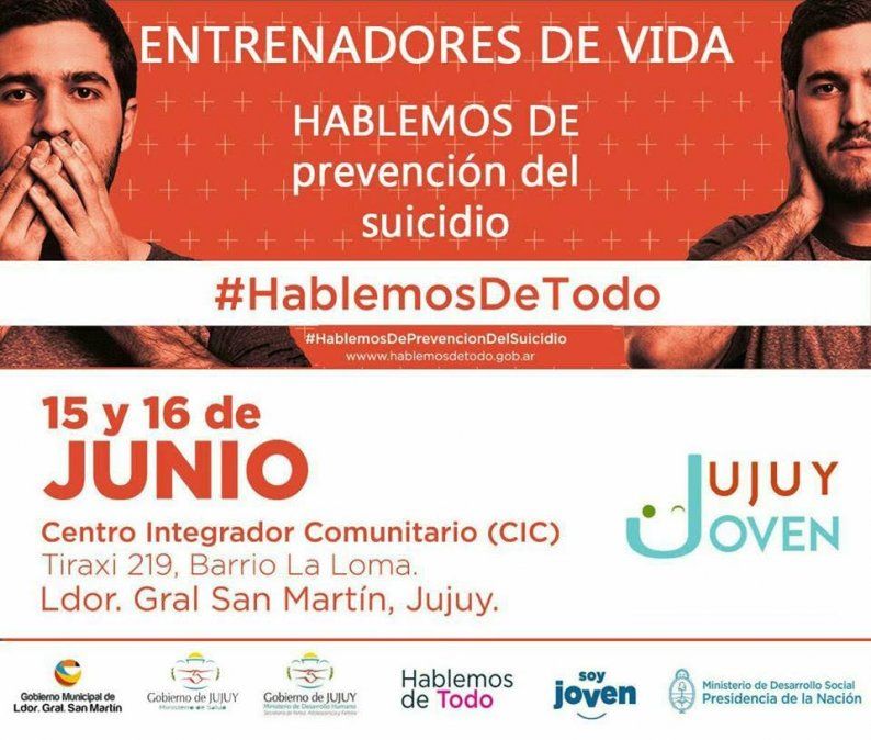 Desde los próximos días del mes de junio, Jujuy será la tercera provincia que se verá beneficiada con la Formación de Interventores Comunitarios para el Trastorno de la conducta Suicida. Esta estrategia fue presentada durante el 2016 en Catamarca y Tucumán y son una propuesta del Ministerio de Desatollo Social de la Nación, la Dirección Nacional de Juventud a cargo de la Dr. Lila Castillo y la organización de la Dirección de la Juventud Provincial, a cargo de Matías Rivera.