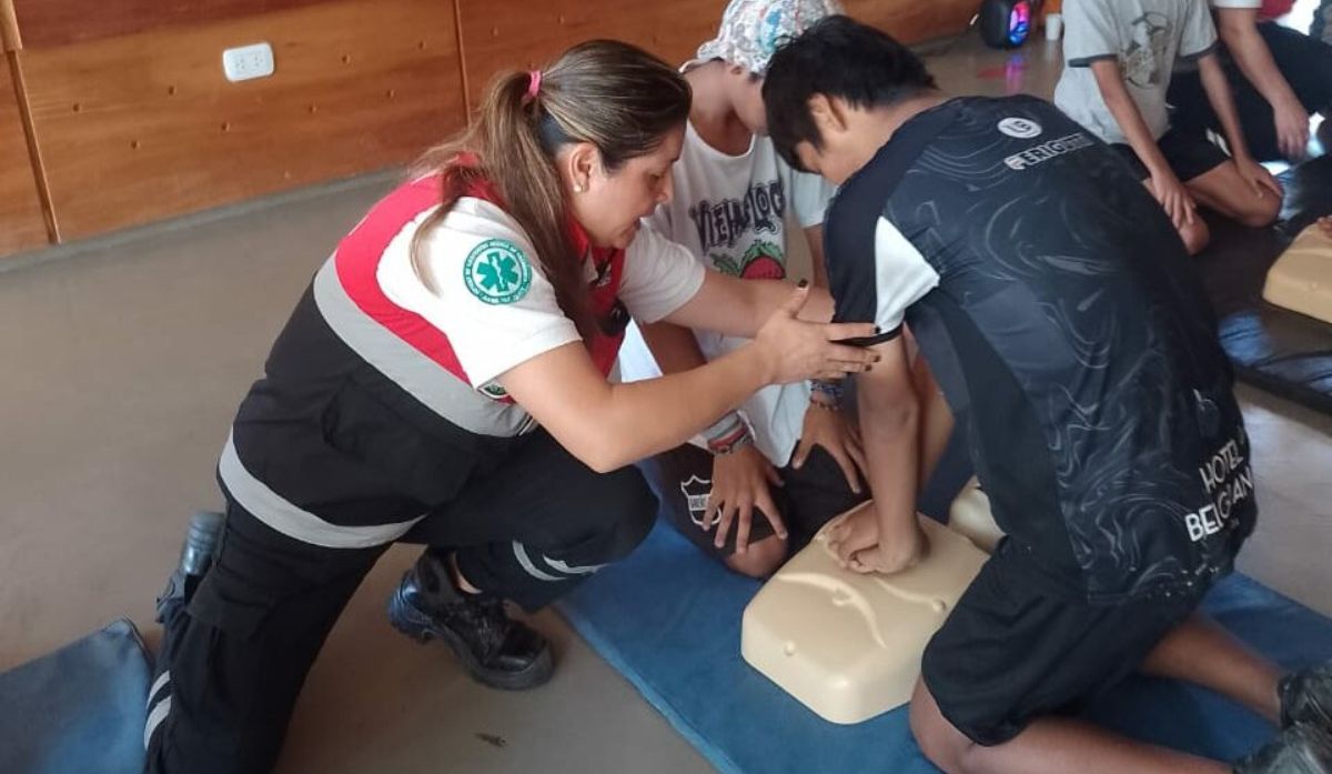 Los profesionales de la salud enseñaron a los niños cómo actuar en caso de accidentes o desvanecimientos. Utilizando muñecos y al ritmo de una canción popular, mostraron de manera práctica la posición de manos y brazos necesaria para realizar la reanimación cardiopulmonar (RCP).