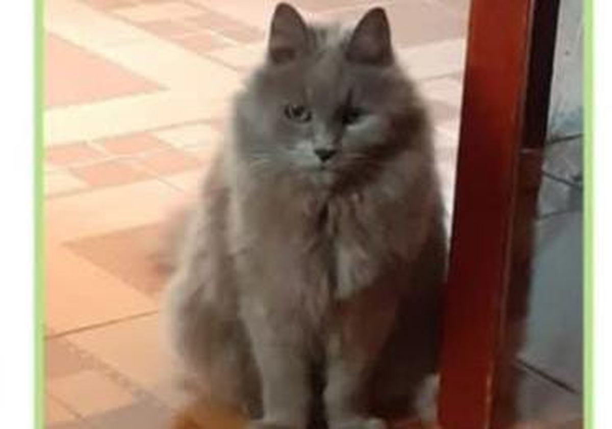 El animal es de porte mediano y de pelaje color gris plateado. Además está castrado. Se extravió el pasado 17 de febrero del presente año.