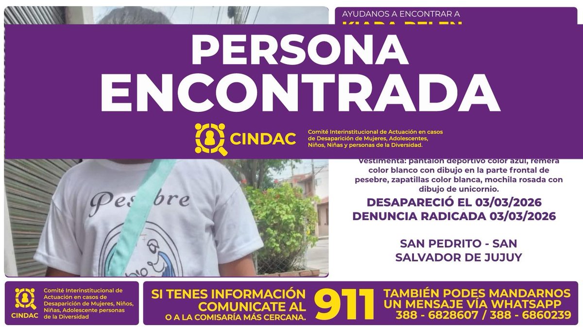 CINDAC y la Policía de la provincia informaron que dieron con el paradero de K. B. S. Calisaya.