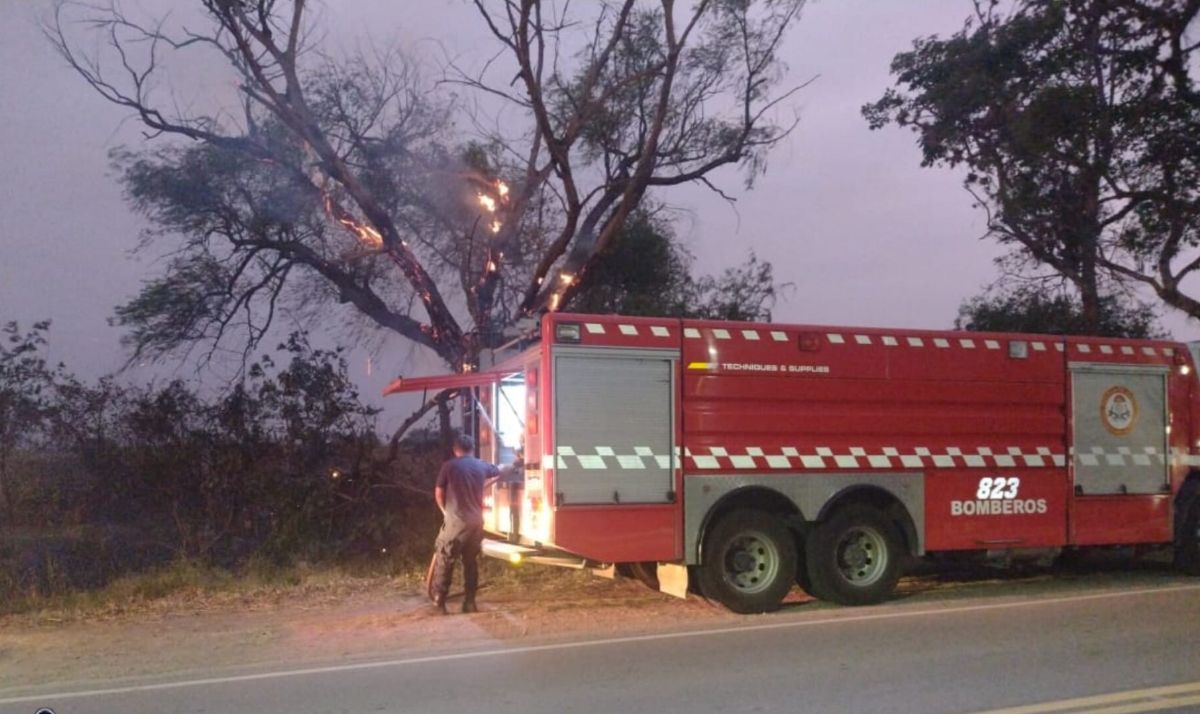 Personal de la Comisaría Seccional N°27 junto a bomberos del Cuerpo policial acudieron al lugar y constataron gran cantidad de pasto quemándose al costado de la Ruta provincial N°56 lo que imposibilitaba el transito normal por el sector.