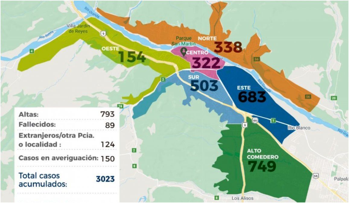 - En el mapa de contagios, Alto Comedero concentra la mayor cantidad con 749 infectados.