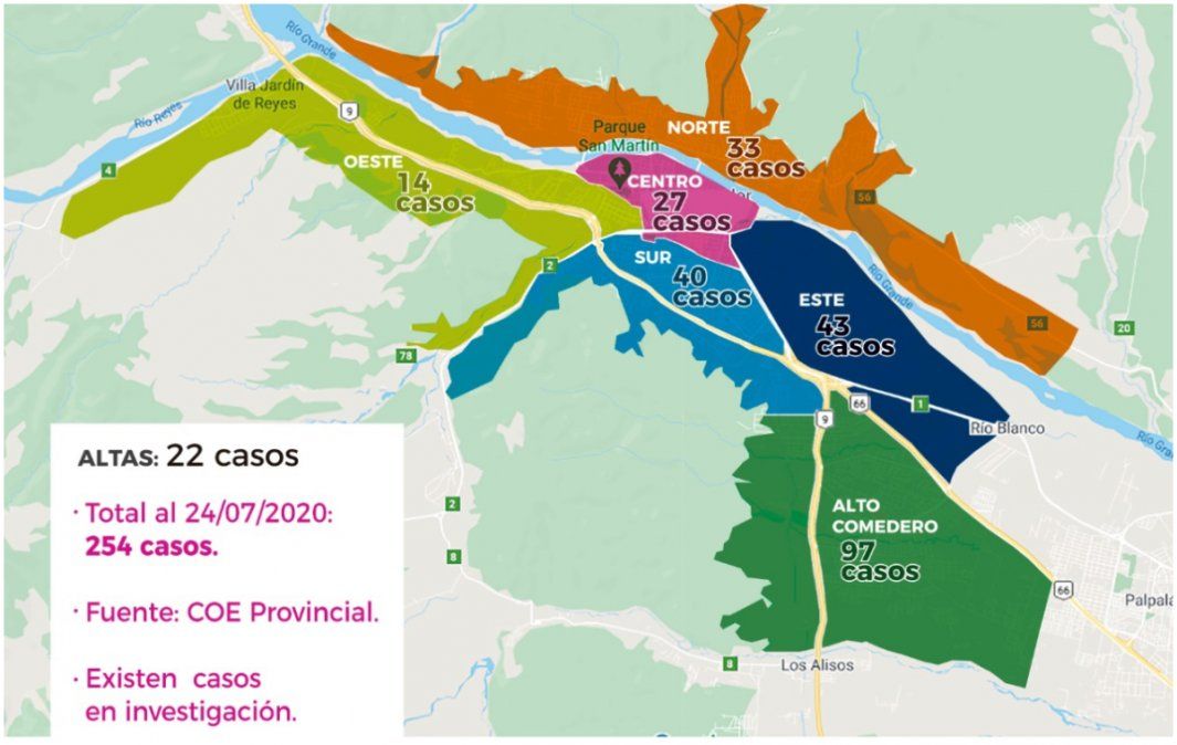 - En el mapa de contagios, Alto Comedero concentra la mayor cantidad con 97 infectados.